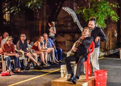 Why a parking lot? "It is a tremendously accessible gathering place in the heart of the city. Like most companies that do Shakespeare, we are following the spirit of Joseph Papp. But putting our own spin on it by placing it in a parking lot, making an urban wrinkle," says Clancy. Shows are offered while the lot is in use. The action sometimes happens around a parked car which drives away during a performance. At such times, the players stop and the audience moves its chairs, pausing the performance the same way a show would stop for rain uptown in Central Park. It's all part of the fun.